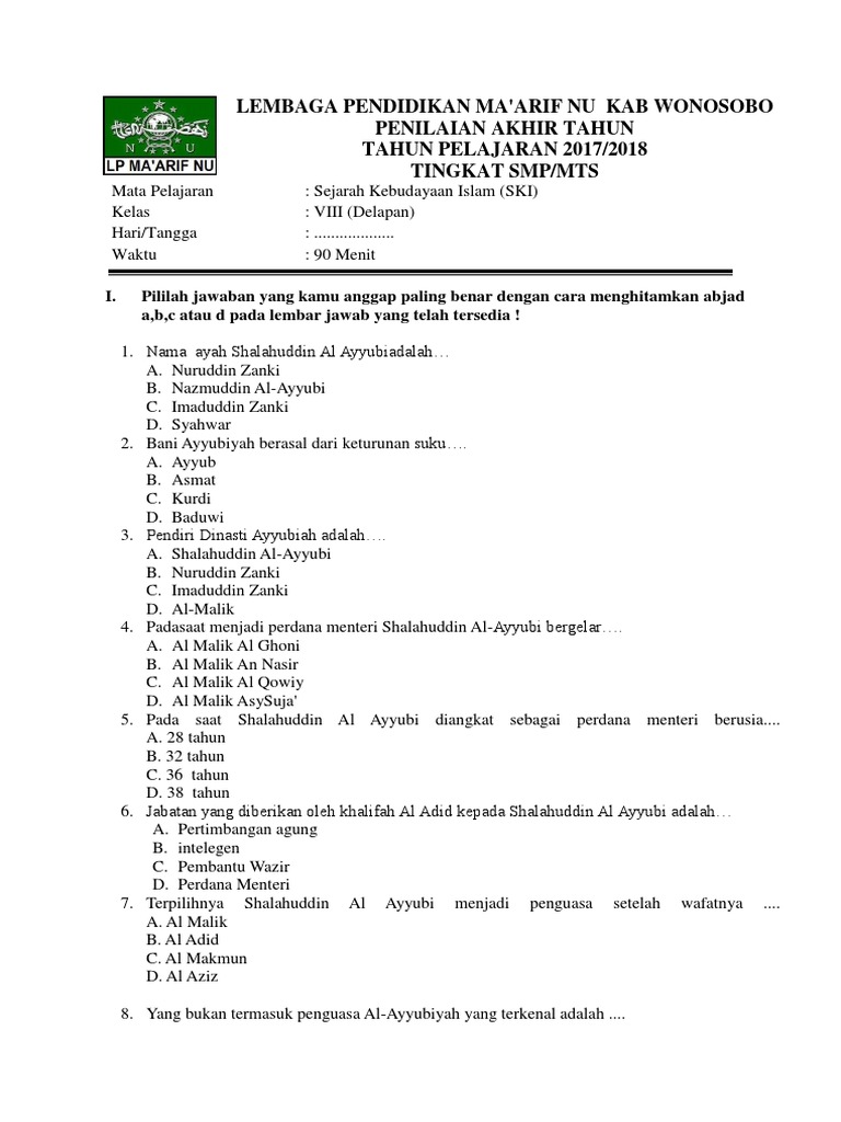 Demikian info kumpulan soal uas / pas smp/mts kelas 8 semester 1 (ganjil) kurikulum 2013 dan ktsp tahun 2021 (tahun pelajaran 2020/2021) dan kumpulan soal pat kelas 8 semester genap. Para sahabat gurujugan, pada postingan kali ini akan berbagi beberapa soal yang mungkin akan dibutuhkan para guru untuk bahan referensi membut soal penilaian akhir semester. Soal pat ski kelas 7 semester 2 plus kunci jawaban dan pembahasan. Soal dan kunci jawaban latihan soal pat ski sejarah kebudayaan islam kelas 8 mts kurikulum 2013. Soal pat ini mencakup materi kelas 8 semester 1 (30%) dan semester 2 (70%). Soal pas (penilaian akhir semester) ganjil untuk mata pelajaran sejarah kebudayaan islam (ski) pada jenjang madrasah ibtidaiyah (mi), baik kelas 3, 4, 5, ataupun 6. Dalam bentuk pdf dan online yang bisa sobat download dan akses secara gratis di artikel ini. We have trained agents standing by so you can soal essay ips kelas 8 semester 2 dan kunci jawaban have live help from real people online or by phone. Kherysuryawanid contoh soal lengkap dengan kunci jawaban mata pelajaran seni budaya kelas 8 smp semester 1 dan semester 2 kurikulum 2013. Soal dan kunci jawaban latihan soal pat ski (sejarah kebudayaan islam) kelas 8 mts kurikulum 2013. Pada kesempatan kali ini admin akan memberikan latihan soal dan kunci jawaban pat ski kelas 3 lengkap dalam pemformatan online dan juga offline (pdf) yang bisa kamu akses secara gratis di artikel ini. Paket soal pas ski mi ini tentu telah disesuaikan dengan materi berdasarkan ki dan kd dalam kma nomor 183 tahun 2019. Untuk menunjang kebutuhan akan soal latihan, di kesempatan kali ini admin akan memberikan soal pat/ukk ski (sejarah kebudayaan islam) kelas 11 kurikulum 2013 ma semester 2.